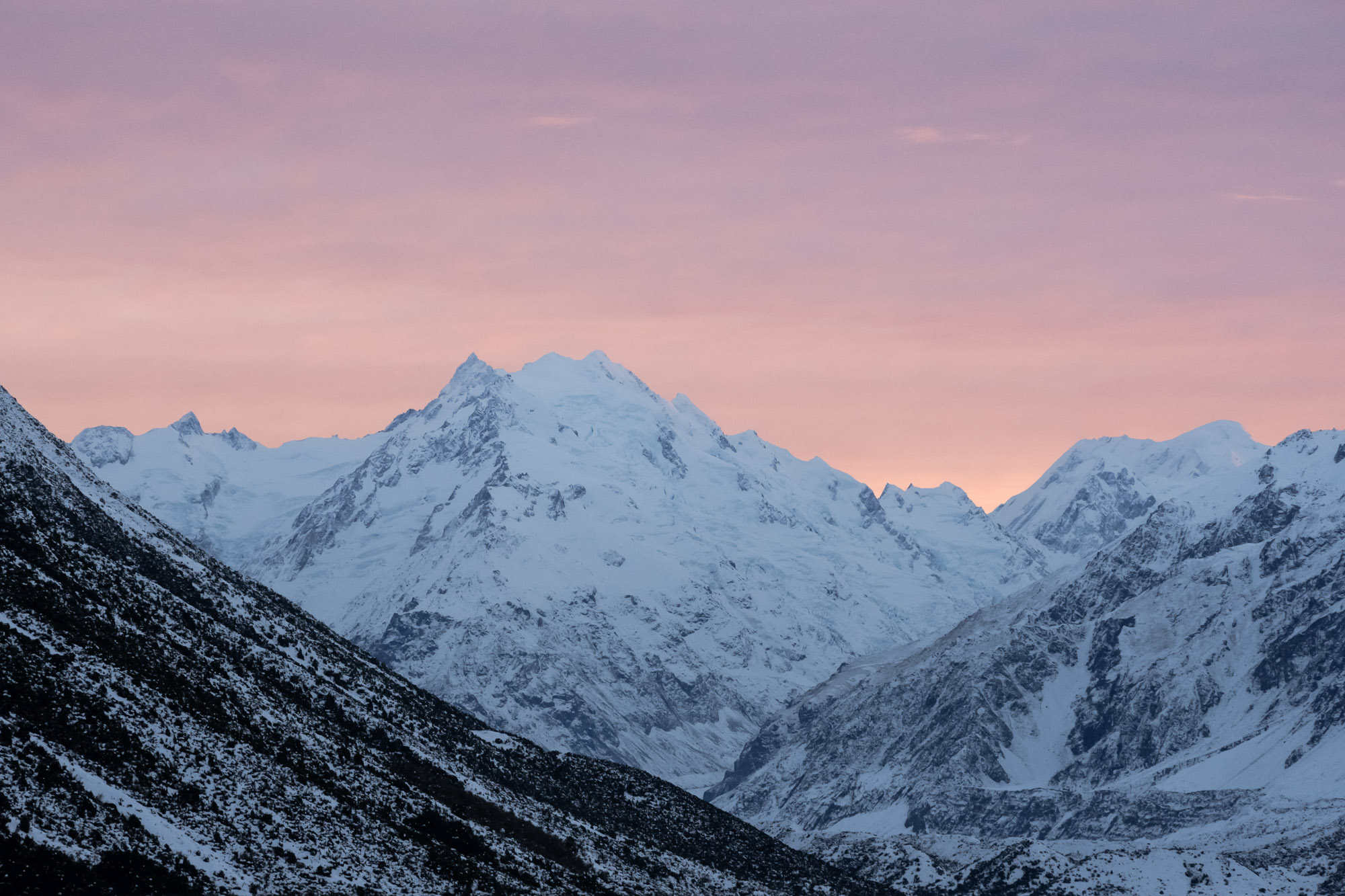 Early rise to catch the sunrise! Regrettably, heavy snowfall over the weekend had resulted in the closure of the roads leading to the hiking trails. Nevertheless, we managed to discover a roadside location to witness the sunrise in all its glory. The remainder of the day was dedicated to exploring the national park, as we traversed the winding roads to admire Mount Cook from various perspectives.